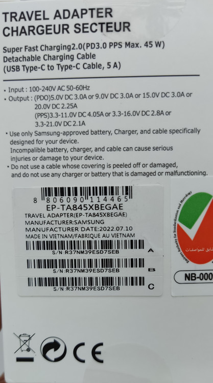 سایر: این شارژر دیواری دارای فناوری PD است که با استفاده از آن می توانید دستگاه خود را با سرعت بیشتر و با توان 45 وات شارژ کنید. برای شارژر 45 وات سامسونگ از چیپ هوشمندی استفاده شده تا با اتصال دستگاه به صورت خودکار جریان مناسب را برای دستگاه تامین کند.