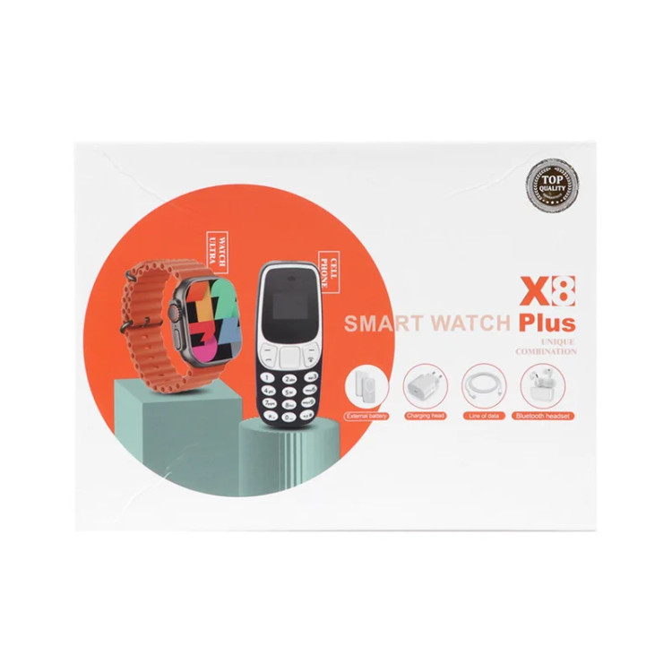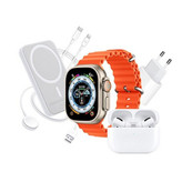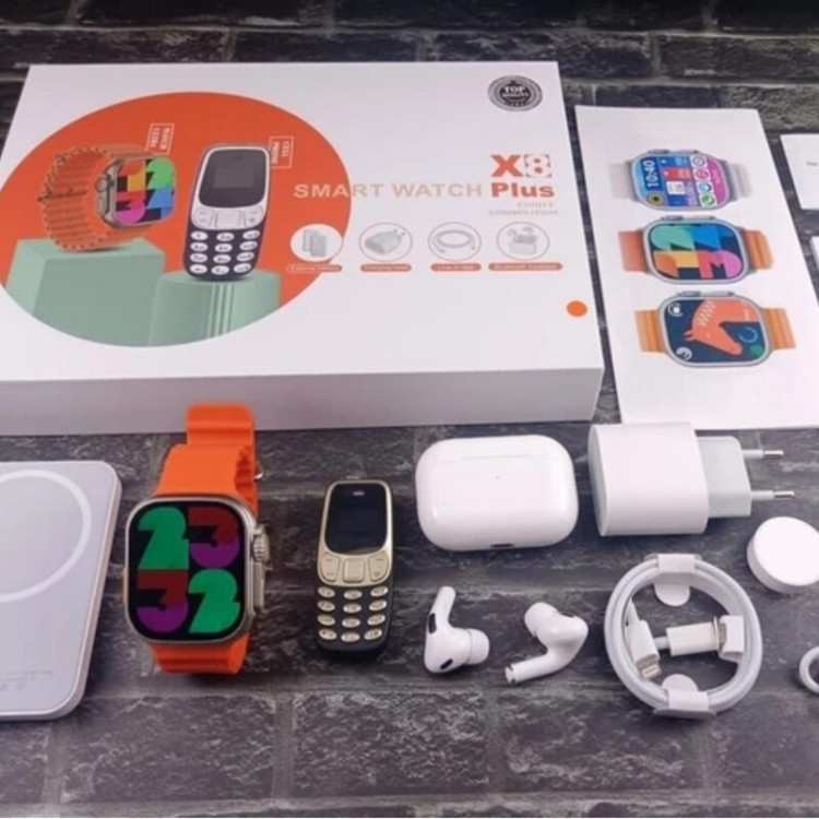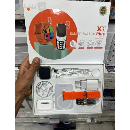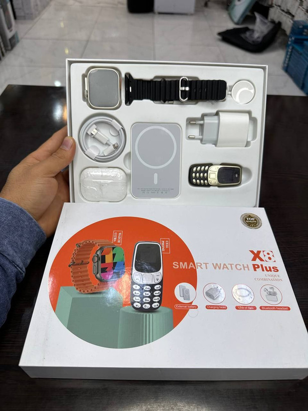 مشخصات: 1-موبایل 2-ساعت هوشمند 3-مگ سیف 4- پاور بانک دارای شارژر وایرلس 5- شارژر و کابل 6-شارژر وایرلس ساعت پک ساعت هوشمند X8 PLUS UINQE COMBINATION همراه با موبایل و ایرپاد و پاور بانک دارای شارژر وایرلس و شارژر و کابل
