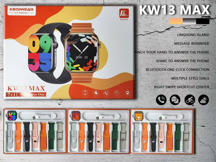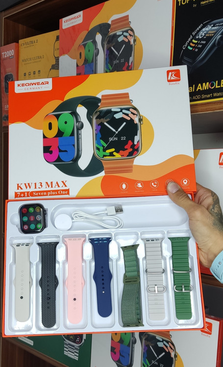 پک ساعت هوشمند از برند keqiwear مدل KW13max به همراه 7 عدد بند ( رنگ بندی بند ها از عکس داخل سایت مشخص است)/ صفحه نمایش : 49 میلیمتر/ صفحه نمایش :OLED ظرفیت باتری : 280 mAh مقاوم در برابر پاشش آب /امکان کنترل تماس ها و برقراری تماس از طریق بلوتوث