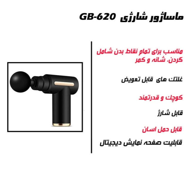 دستگاه ماساژور شارژی گان مدل 620 اصلی به همراه 4 عدد سری برای مشتریان ارسال میشود /توان مصرفی : 220 وات /موتور توربو /دارای 4 سری جهت ماساژ دارای 6 درجه سرعت/ نوع باتری : لیتیومی 1800 میلی آمپر /
