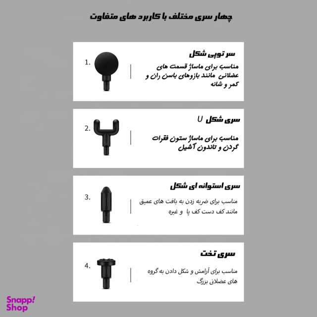 6 شدت ماساژ مختلف ، سرعت ضربه 2100-3600 در دقیقه ، می توانید شدت را تنظیم کرده و ماساژ را با توجه به نوع عضله و بعد از ورزش آرامش بخش کوفتکی عضلات شما باشد