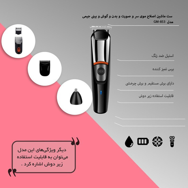 به همراه ست GM-853 یک عدد شانه راهنما قابل تنظیم و یک عدد شانه ثابت جهت ایجاد اصلاح در اندازه های مختلف قرار داده شده است.
