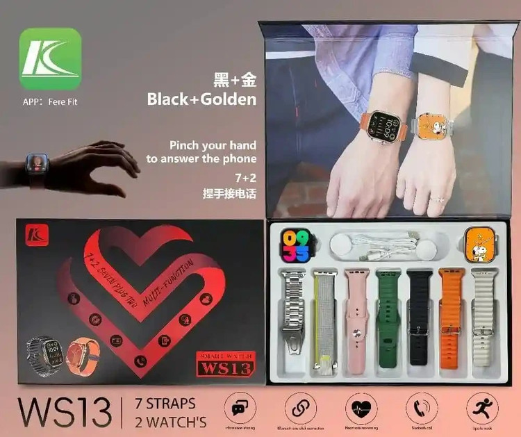 داخل این جعبه دو عدد ساعت هوشمند با کیفیت یکی از نوع طرح اپل واچ اولترا با سایز 49 میلی متر و دیگری از نوع ساعت هوشمند طرح اپل واچ سری 9 با سایز 45 میلی متر قرار دارد. 2 عدد شارژر وایرلسی و 7 عدد بند متنوع