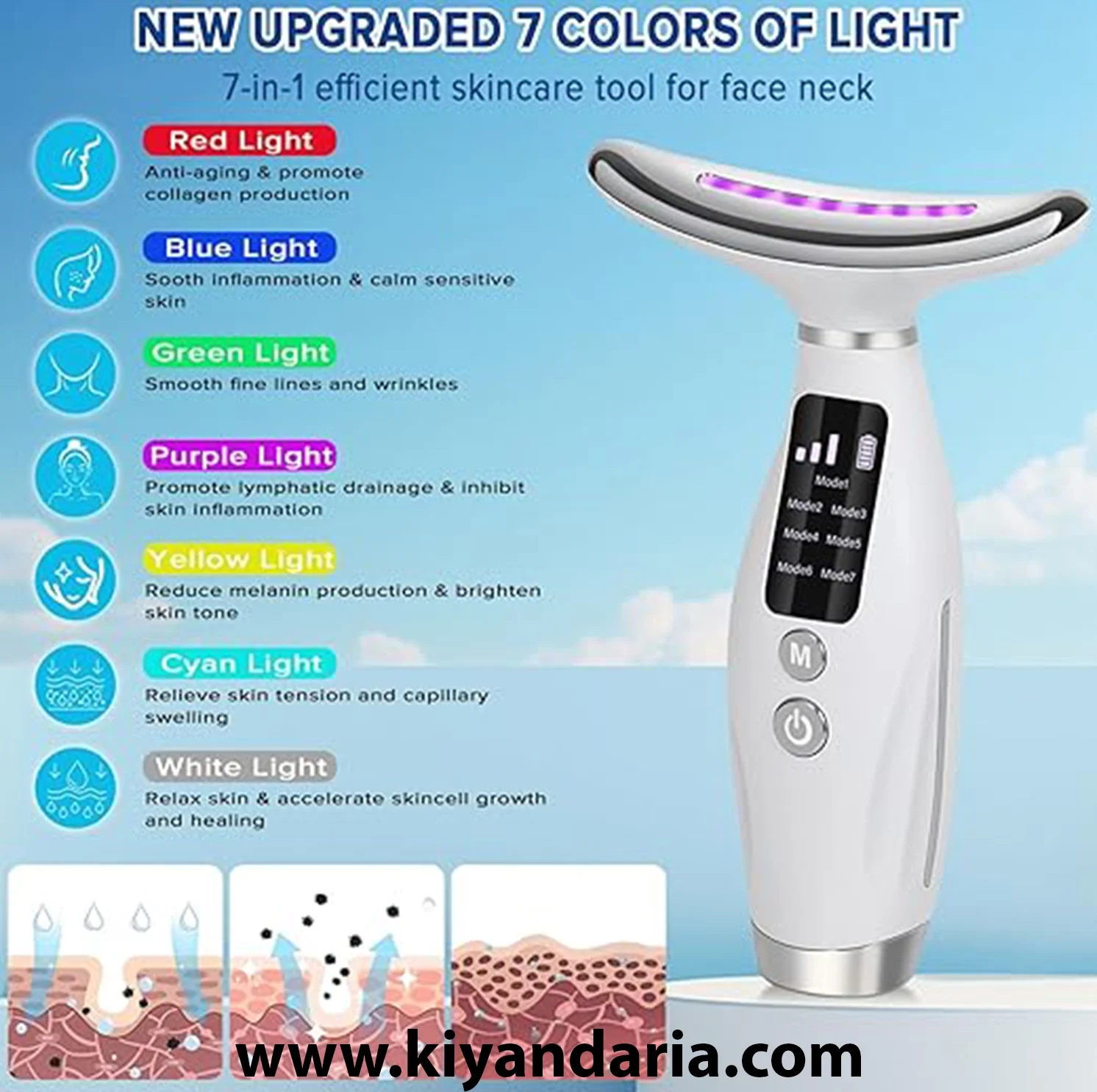 این دستگاه مجهز به ۷ رنگ نور LED با کاربردهای مختلف مراقبت پوستی است. هر رنگ تأثیر متفاوتی بر پوست دارد؛ از کاهش التهاب و بهبود لکها گرفته تا سفتسازی و افزایش کلاژنسازی.